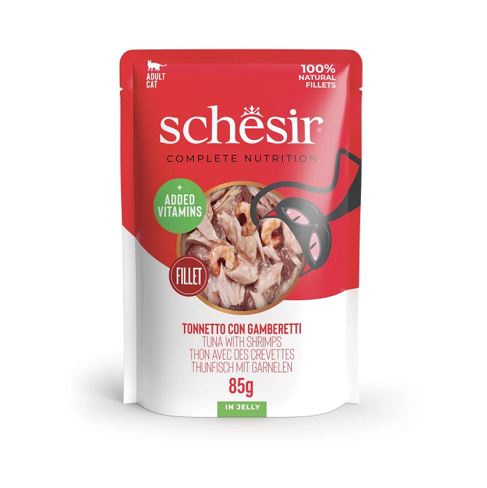 Schesir 提供貓咪所需的所有必需營養素,鮮嫩的蒸鮪魚片搭配蝦仁凍,帶來天然美味的組合,即使是最挑剔的貓咪也會愛不釋口。