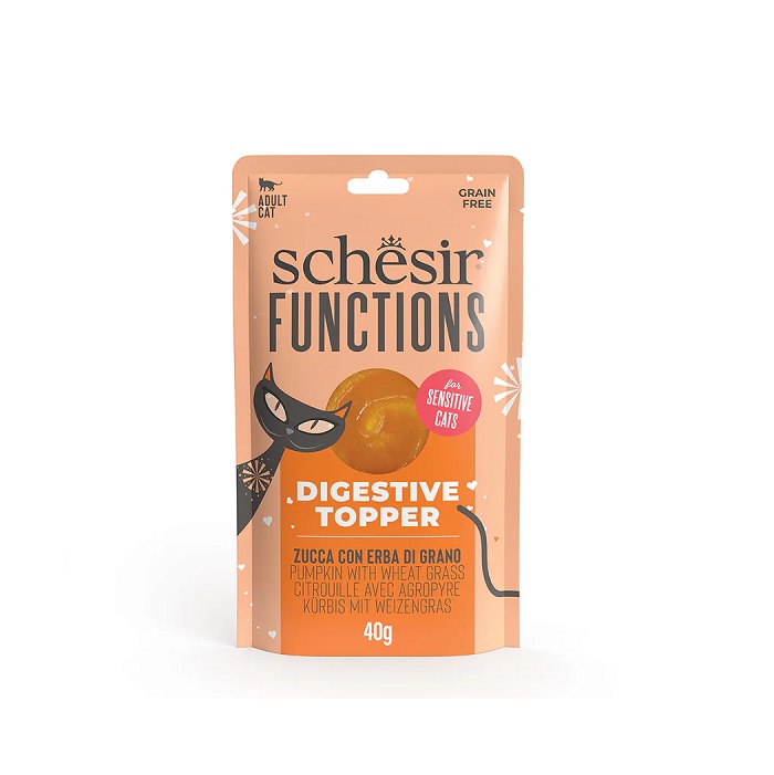 一款功能性補充貓糧,配方簡單,質地宜人,以南瓜泥為主要成分,添加了小麥草,旨在幫助消化敏感的貓咪。